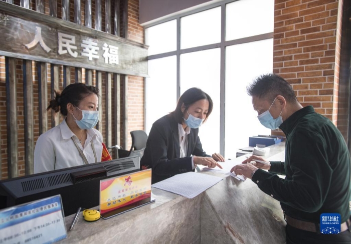 2020年9月18日,湖北省武漢市青和居社區(qū)服務(wù)中心工作人員協(xié)助社區(qū)居民填寫材料。新華社記者 肖藝九 攝