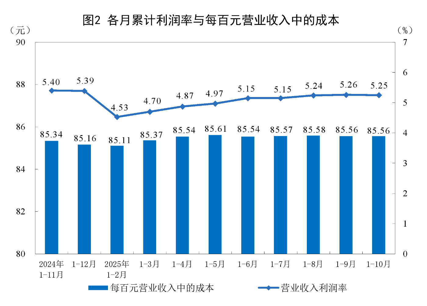 1—10月份,規模以上工業企業實現營業收入113.37萬億元,同比增長1.8%;發生營業成本97.00萬億元,增長2.0%;營業收入利潤率為5.25%,同比提高0.01個百分點。