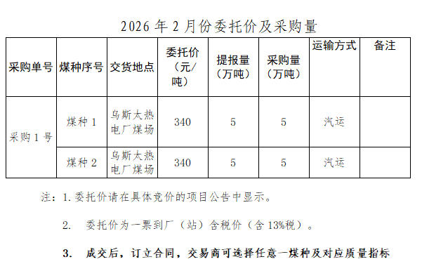 內蒙古能源集團有限公司計劃對所屬烏斯太熱電廠2026年2月市場煤采購進行電子專場交易,交易信息現對外公開發布,凡符合條件的交易商均可參加。