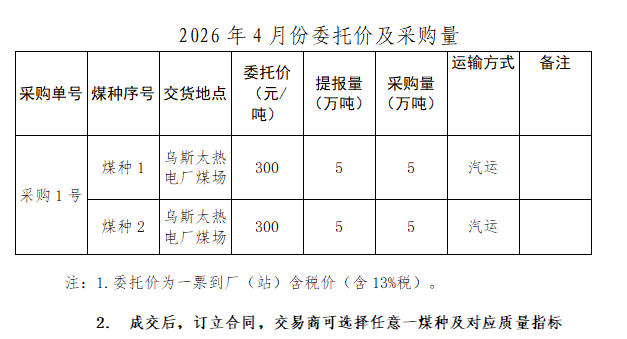內(nèi)蒙古能源集團(tuán)有限公司計(jì)劃對所屬烏斯太熱電廠2026年4月市場煤采購進(jìn)行電子專場交易,交易信息現(xiàn)對外公開發(fā)布,凡符合條件的交易商均可參加。